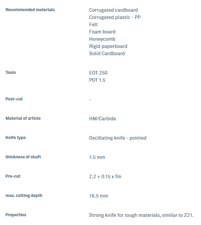 This high quality generic blade is suitable for Zund S3, G3 & L3 digital cutters using EOT-250 and POT tool heads. This pointed oscillating blade has a cutting angle of 81.5°and a maximum cutting depth of 16.5 mm. This blade is suitable for saddle leather, leather, rubber and corrugated plastic. This high quality generic blade corresponds to Zund part number 5201345, also called Z60 blade.
